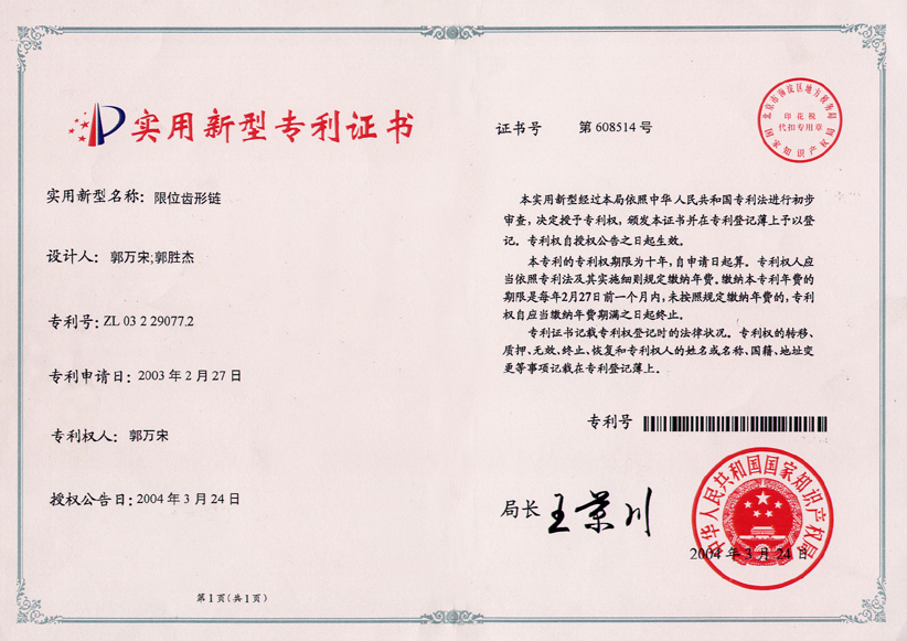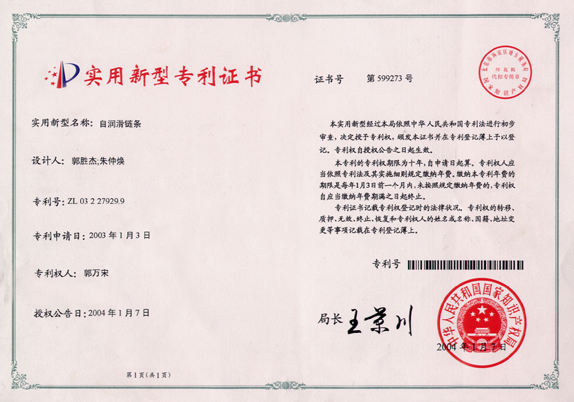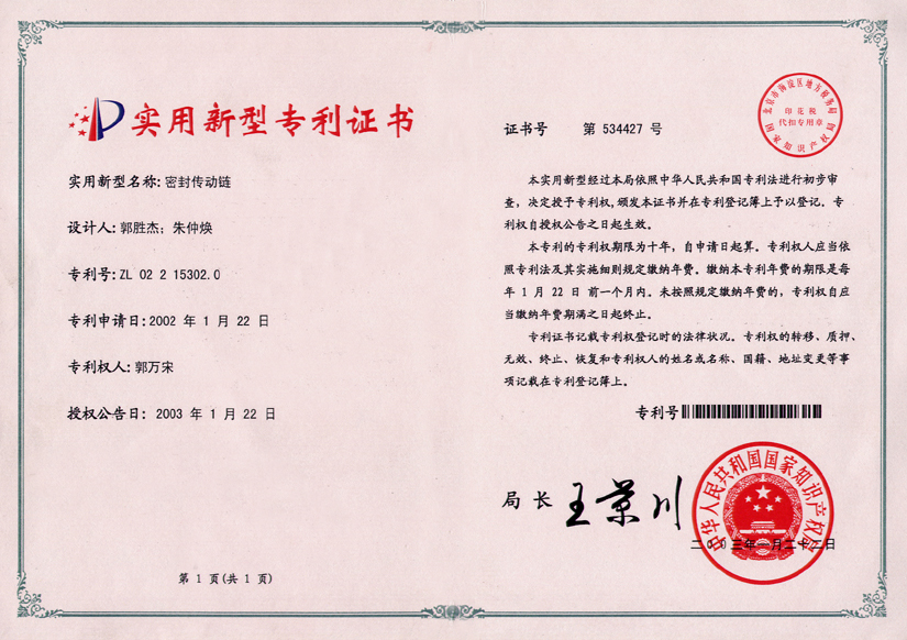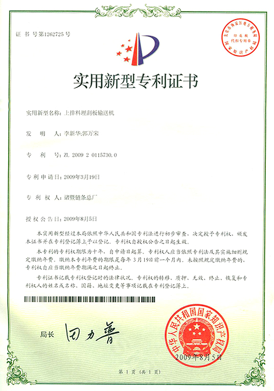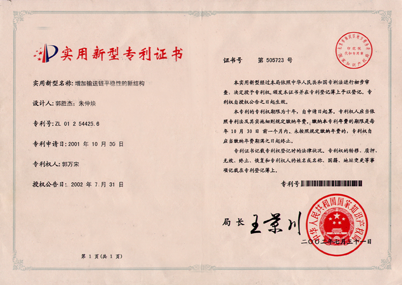 实用新型专利证书(增强输送链耐磨性的新结构)